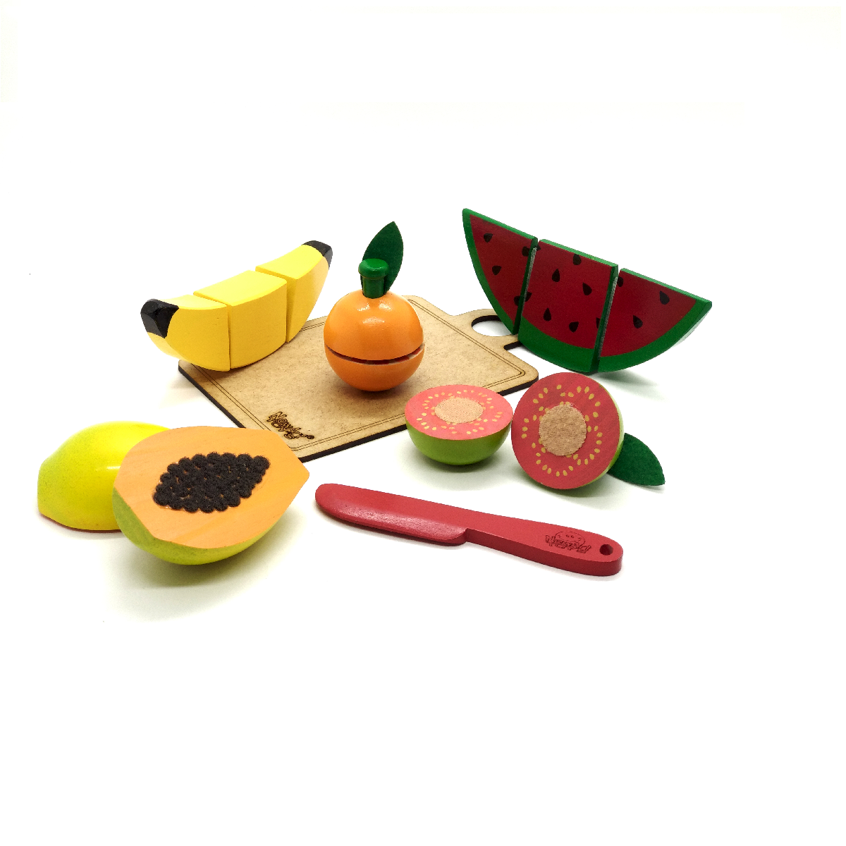 Contém: 7 peças no total, sendo: 1 Banana com corte, 1 Laranja com corte, 1 Goiaba com corte, 1 Mamão com corte, 1 fatia de melancia, 1 faca de madeira, 1 tábua de madeira